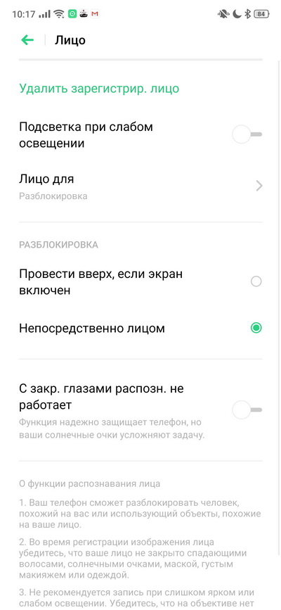 Разблокировка по лицу имеет два варианта защиты - простой и расширенный. В расширенном режиме лучше надежность, но смартфон не распознает лицо в солнечных очках или затемненных хамелеонах. В обычном режиме в затемненных очках распознает.