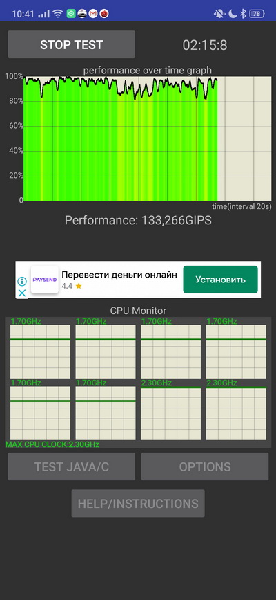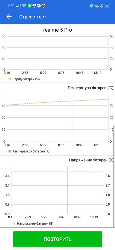 Стресс-тест AnTuTu. Температура батареи повысилась очень незначительно и через пятнадцать минут стресс-теста составляла 35 градусов.