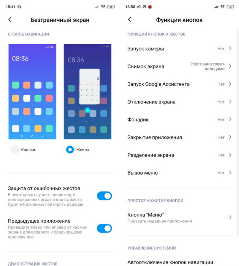 Традиционная для смартфонов Xiaomi возможность вместо экранных кнопок (настраиваемых) задать управление жестами. Это настраивается в пункте меню "Безграничный экран". Также дополнительно можно настраивать функции кнопок.
