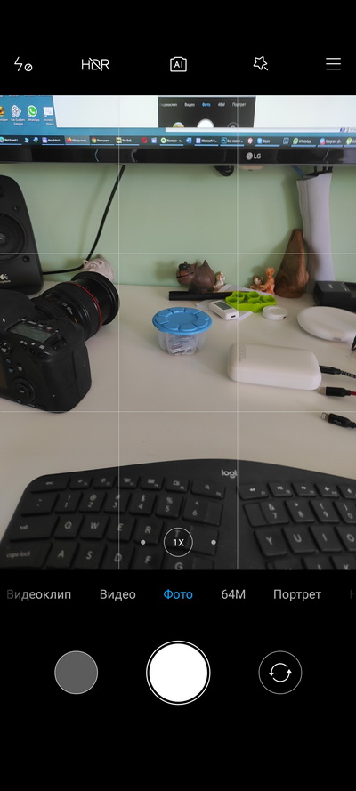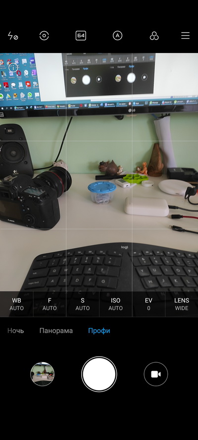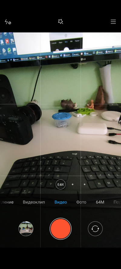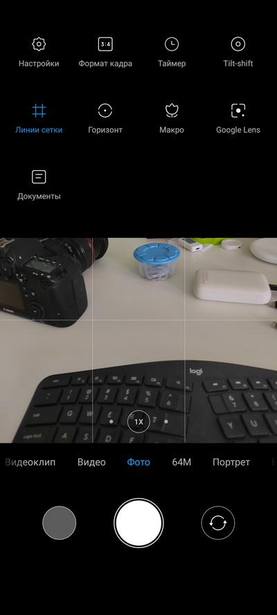 Стандартный для Xiaomi интерфейс камеры. Снизу переключаются режимы: замедление, видеоклип, видео, фото, 64 Мпикс, портрет, ночь, панорама, профи. Над этим специальными пиктограммами переключаются три камеры: сверхширик, основной модуль, двукратный зум.
