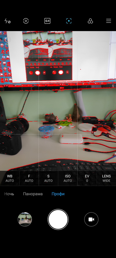 Режим профи. Там среди верхних пиктограмм есть режим высокой четкости (64 Мпикс), также можно выделять области фокусировки (пиктограмма справа) и проверять экспозицию.