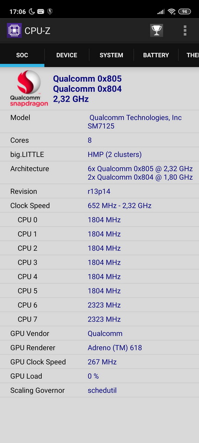 Процессор: Qualcomm SM7125 Snapdragon 720G (8 nm), CPU Octa-core (2 × 2.3 GHz Kryo 465 Gold & 6 × 1.8 GHz Kryo 465 Silver)