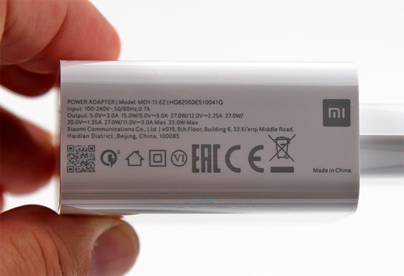 Сразу смотрим на характеристики адаптера питания - да, поддерживает максимальную мощность в 33 ватта, не пожлобились. А то, знаете ли, есть всякие самсунги и прочие эпплы, которые в дорогущие смартфоны кладут копеечные маломощные зарядки. Здесь же смартфон недорогой, а адаптер - максимальной мощности. Респект, как я считаю, и уважуха таким производителям.