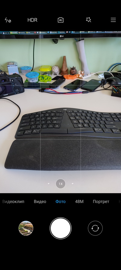 Стандартный для Xiaomi интерфейс камеры. Снизу переключаются режимы: замедление, видеоклип, видео, фото, 48 Мпикс, портрет, ночь, панорама, профи. Для режима фото можно регулировать вспышку, HDR, включить AI, макрорежим, режим улучшения и вызывать настройки.
