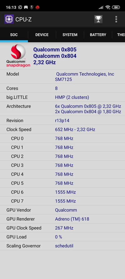 Процессор: Qualcomm SM7125 Snapdragon 720G (8 nm), CPU Octa-core (2 × 2.3 GHz Kryo 465 Gold & 6 × 1.8 GHz Kryo 465 Silver)