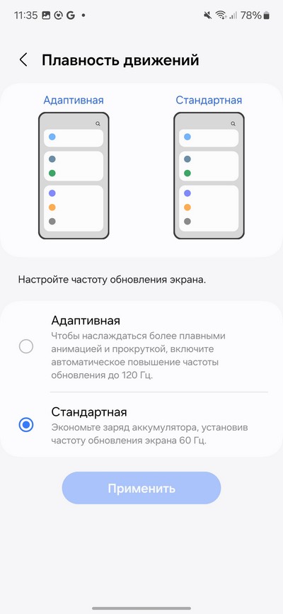 Частота обновления выставляется или автоматическая, адаптивная, или ее можно уменьшить до стандартных 60 Гц.