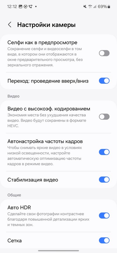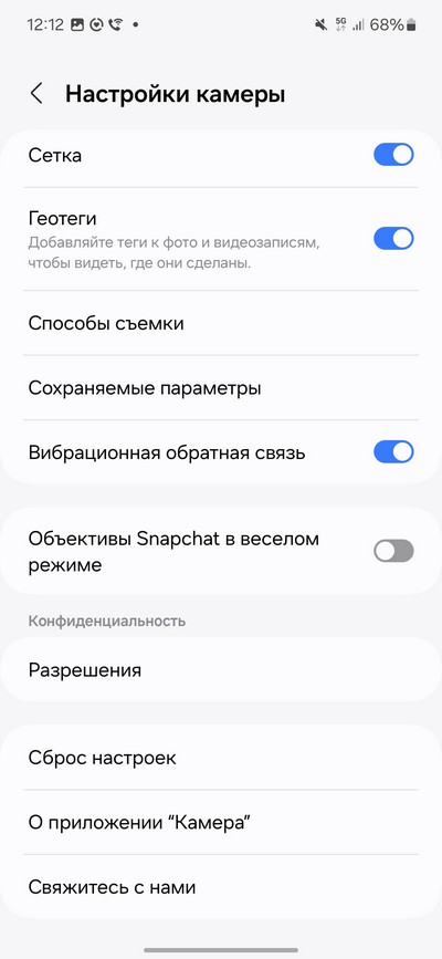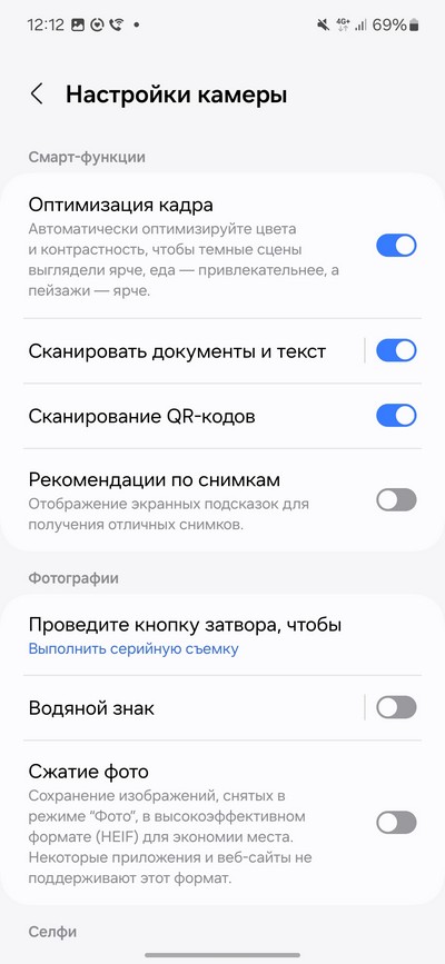 Стандартный самсунговский интерфейс камеры. Сверху настройки, снизу переключение режимов и переключение между сверхшириком, основной камерой и двойным цифровым зумом.