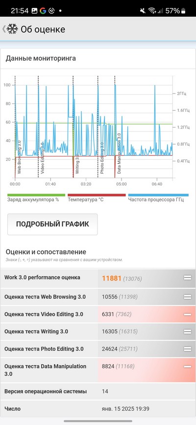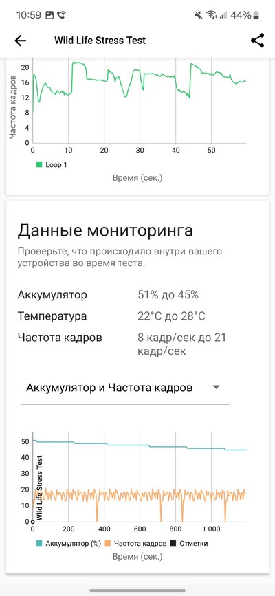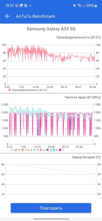 Тест на троттлинг. Первые три минуты потери производительности не было вообще, после трех минут серьезной нагрузки производительность опустилась всего на 10%.