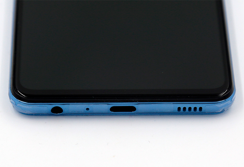 На нижней грани - аудиовыход, микрофон, порт Type-C, решетка стереодинамика (в качестве второго динамика используется разговорный).