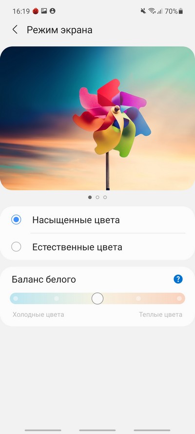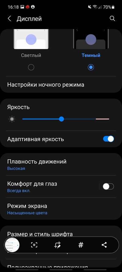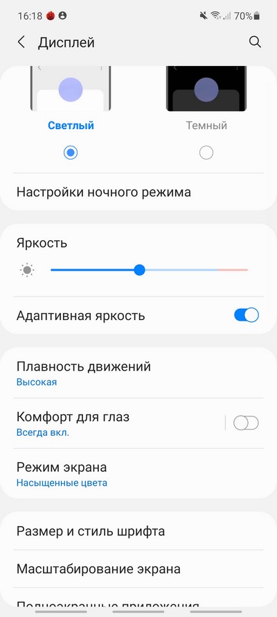 Настройки дисплея. Можно выбрать режим - светлый, темный.