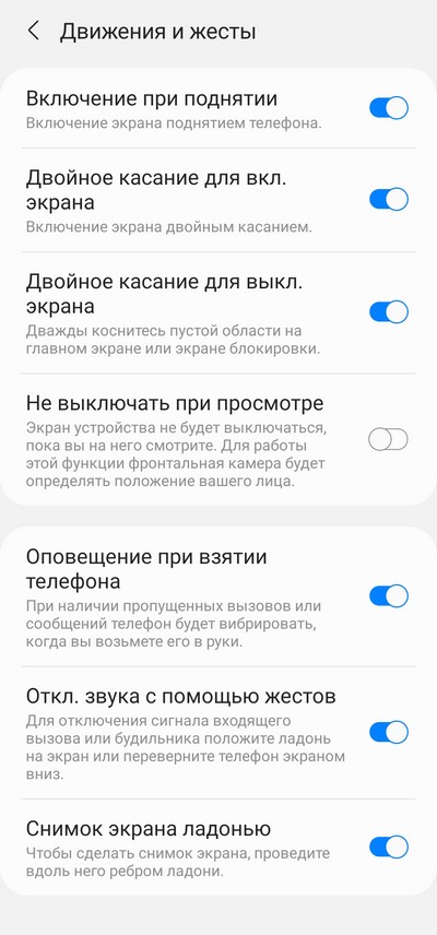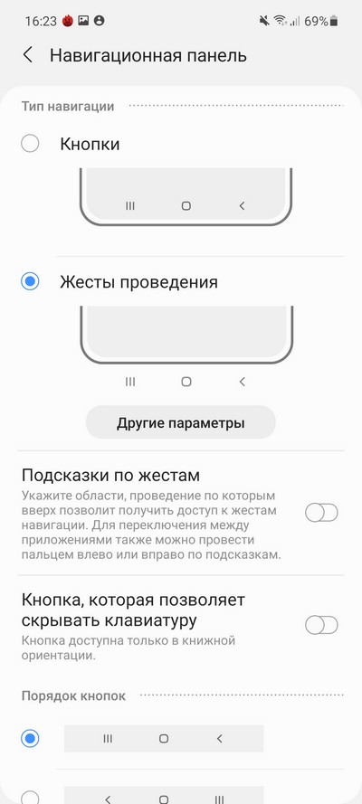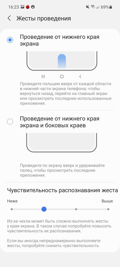 Как обычно, управлять смартфоном можно с помощью кнопок навигации (они настраиваются) или с помощью жестов. Также, как обычно у смартфонов Samsung, кроме стандартных жестов здесь можно включать жесты только от нижнего краях экрана, что лично мне нравится больше всего.
