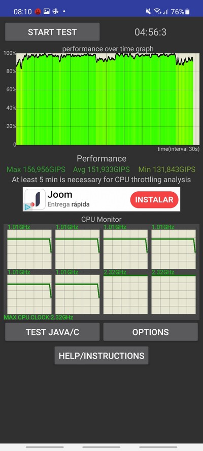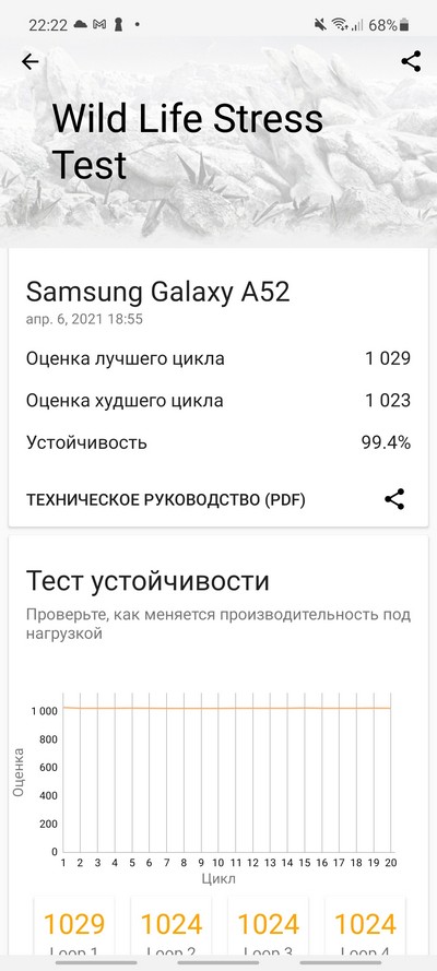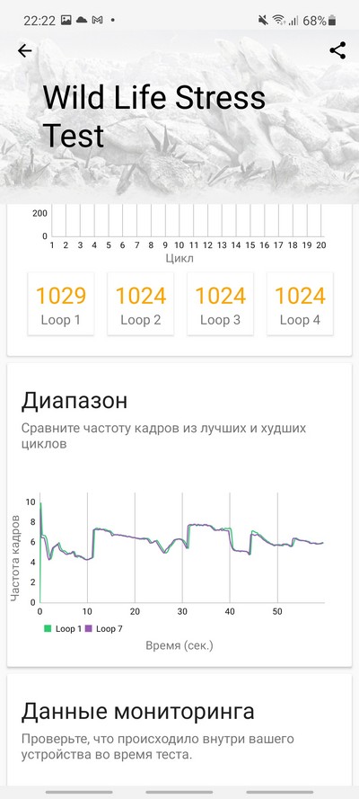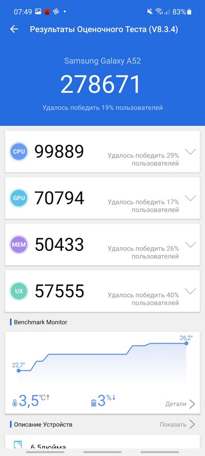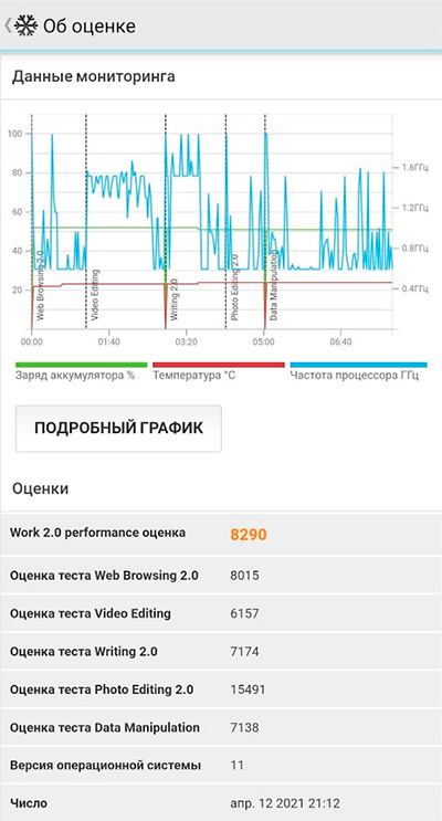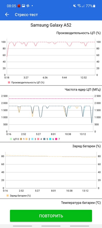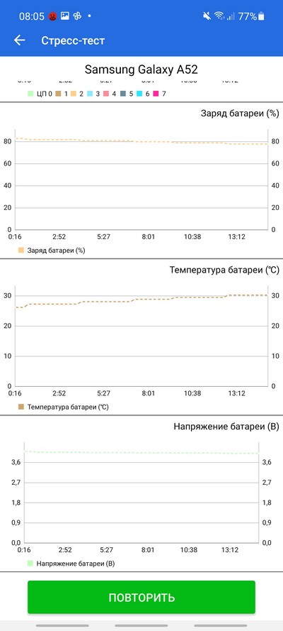 Стресс-тест по AnTuTu. Отлично - потери производительности практически нет, температура еле-еле поднялась до 30 градусов, смартфон очень "холодный".