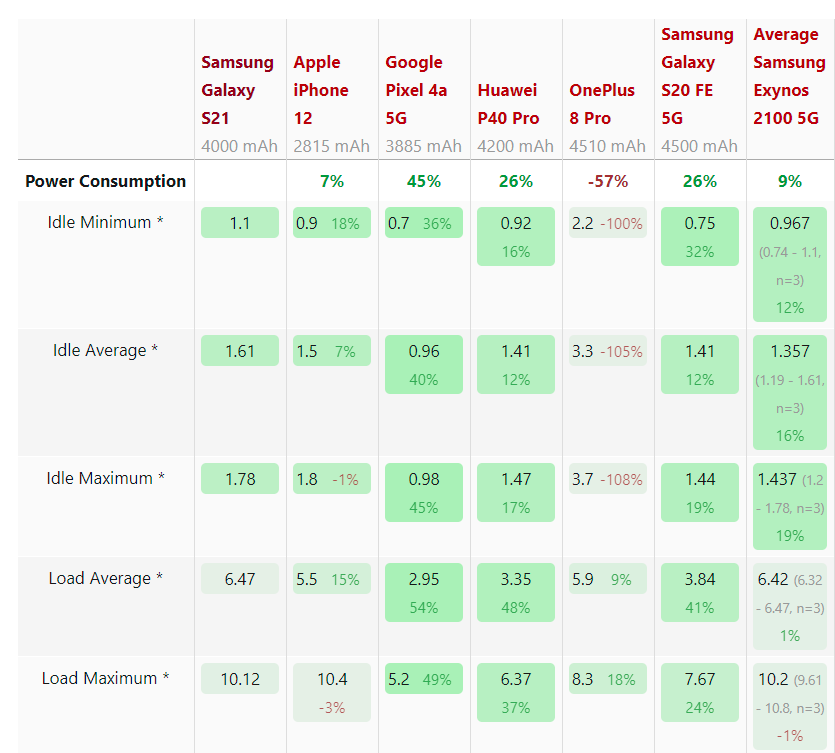 И похоже, что новый Exynos 2100 в плане энергоэффективности вышел ничуть не лучше. Извините уж: показатель Load Average у S21 - 6,47 Вт, тогда как у S20 5G - всего 3,84 Вт.