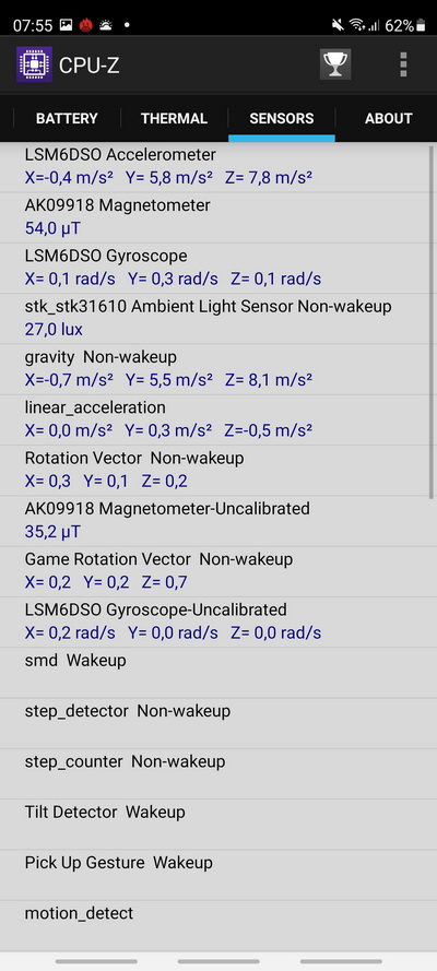 Дополнительно: акселерометр, гироскоп, геомагнитный датчик, датчик Холла, RGB датчик освещенности, датчик виртуального присутствия, FM-радио