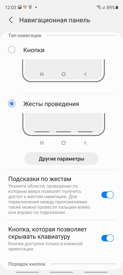 Как обычно у Samsung, здесь кроме обычных экранных кнопок (настраиваемых) и стандартных андроидных жестов есть еще и отдельный режим жестов только от нижней кромки. И именно этот режим лично я считаю самым удобным!