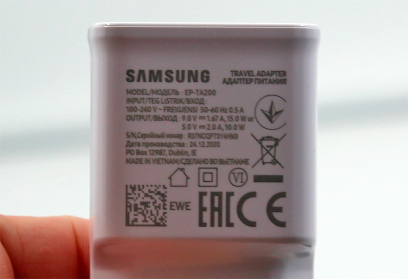Адаптеру, как обычно, не доложили мощности: он на 15 ватт, а смартфон вроде как поддерживает 25 ватт. Но это традиционное самсунговское жлобство: они даже в комплекте с дорогущим Samsung Galaxy S20 Ultra, типа как поддерживающим зарядку в 45 ватт, ухитрились положить адаптер на 25 ватт. Я думаю, что это делается исключительно в целях борьбы за экологию.