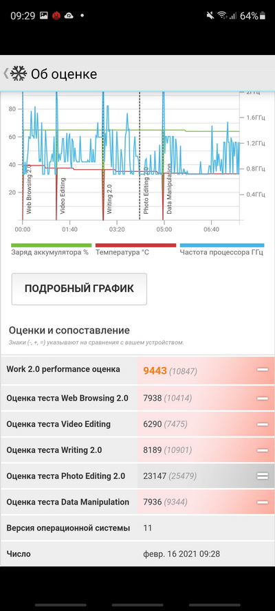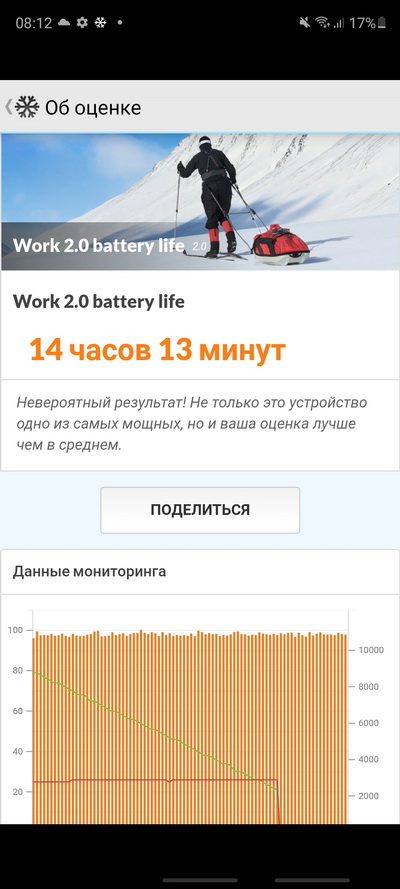 Синтетический тест PCMark - важный показатель. Больше 14 часов - отлично: это означает, что под серьезной нагрузкой смартфон спокойно продержится часов 18.