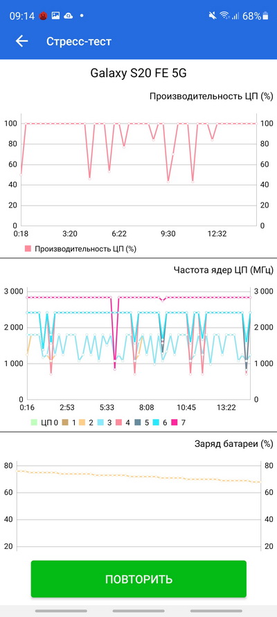 Тест на троттлинг - тоже хорошо, практически никакой потери производительности нет.