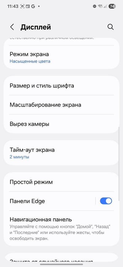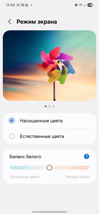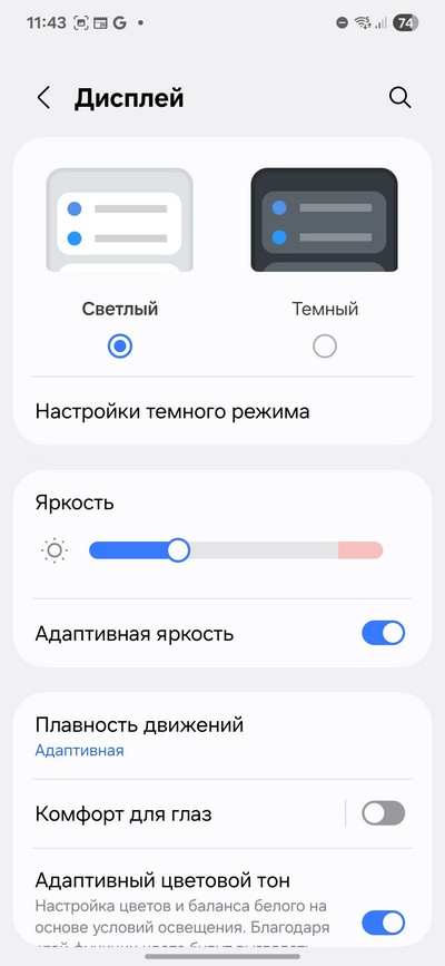 В настройках экрана есть темный режим, режим чтения, можно настраивать размер шрифта и масштаб. Частота обновления может подбираться автоматически, а может задаваться вручную.