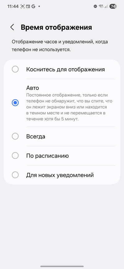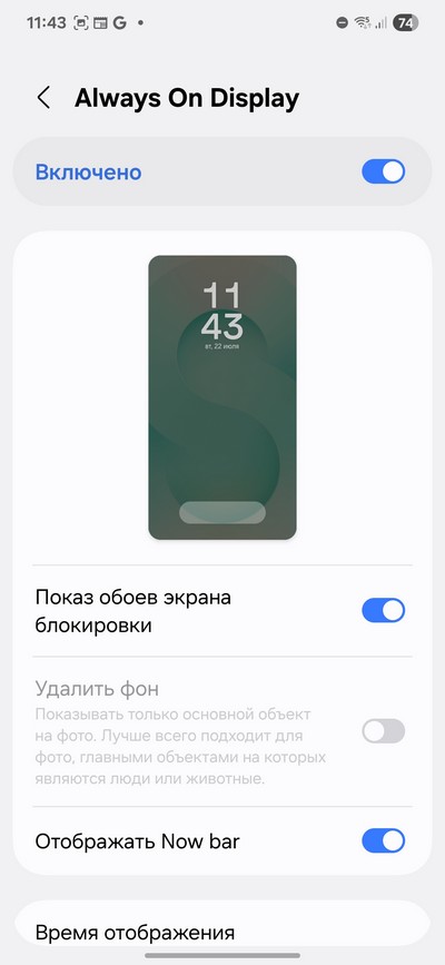Настройки режима AOD. Туда могут выводиться уведомления, также там могут показываться обои экрана блокировки, виджеты экрана блокировки и Now Bar ("Мой день" - персонализированная сводка с рекомендациями).