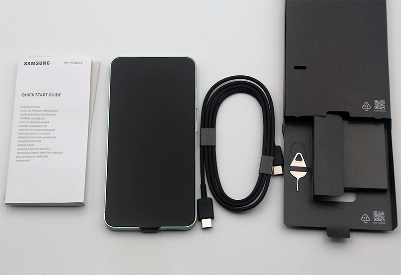 Это Samsung, и мы знаем, что обнаружим в комплекте: смартфон, кабель для зарядки, руководство пользователя, инструмент для вытаскивания вставки под симкарты.