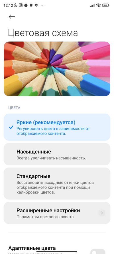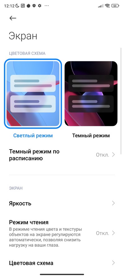 Настройки экрана - стандартные для Xiaomi: есть светлый и темный режим, режим чтения, настраивается цветовая схема, шрифт и размер текста.
