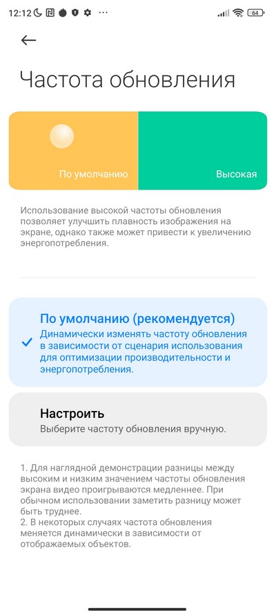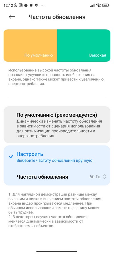 Частота обновления по умолчанию меняется динамически, но можно принудительно выставить 60 Гц или 120 Гц.