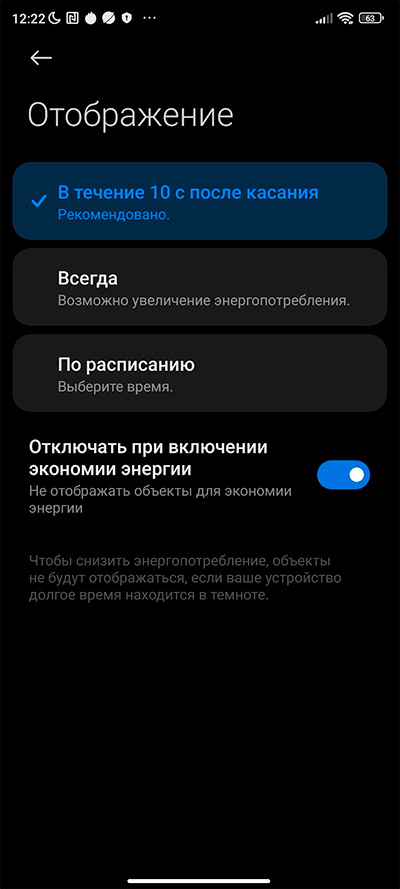 Есть режим активного экрана, и здесь можно задавать, как он будет работать. И нет такого дурдома, как с Redmi Note, где активный экран отображается только 10 секунд, и это нельзя поменять.