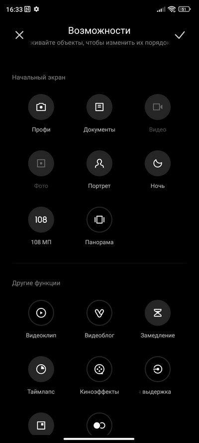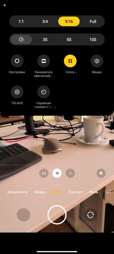 Интерфейс камеры. Снизу переключаются режимы: профи, видео, фото, портрет, 108 Мпикс, видеоблог (Vlog), и этот набор настраивается. Выше переключение между сверхшириком, основной камерой и цифровым зумом (по умолчанию 2-кратный, но можно вызвать линейку зумов и масштабировать до 10-кратного). Сверху - пиктограммы различных переключателей и пиктограмма меню. На правом скриншоте - окно меню с настройками.