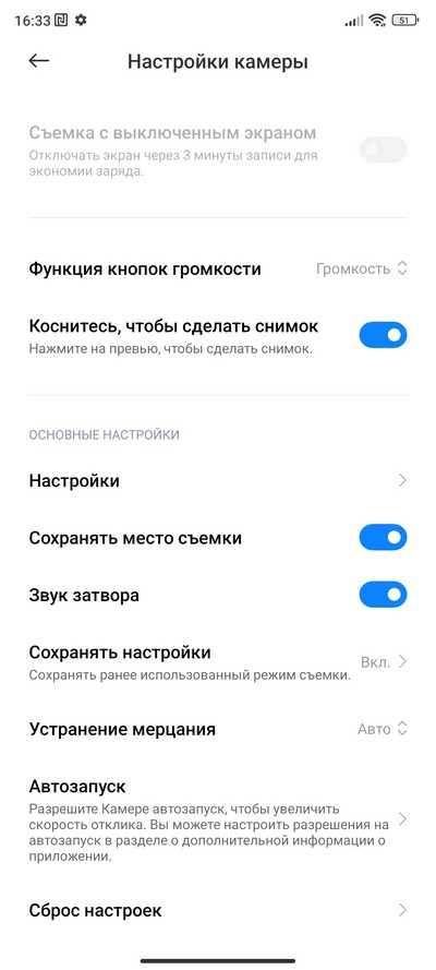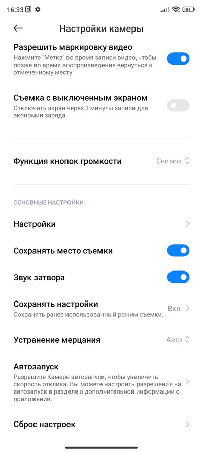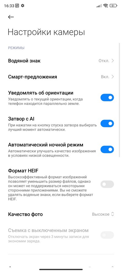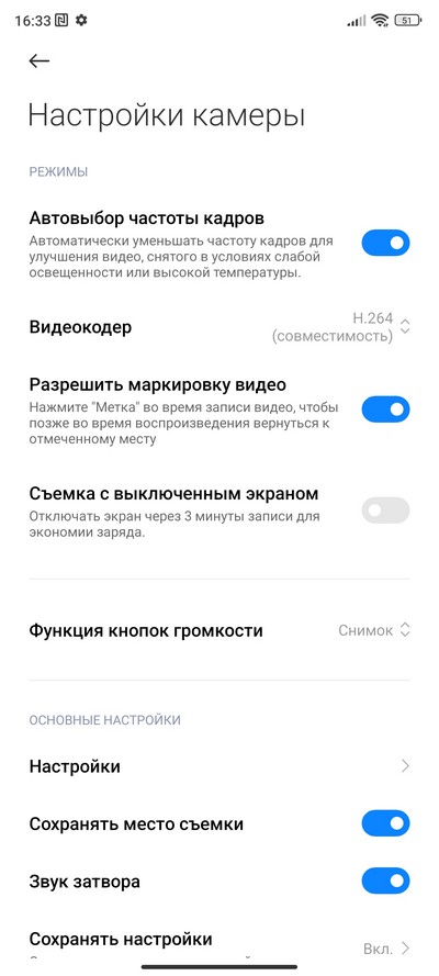 Настройки видео. Есть съемка видео на сверхиширик, но него нужно переключиться перед стартом съемки. И видео будет только FullHD.