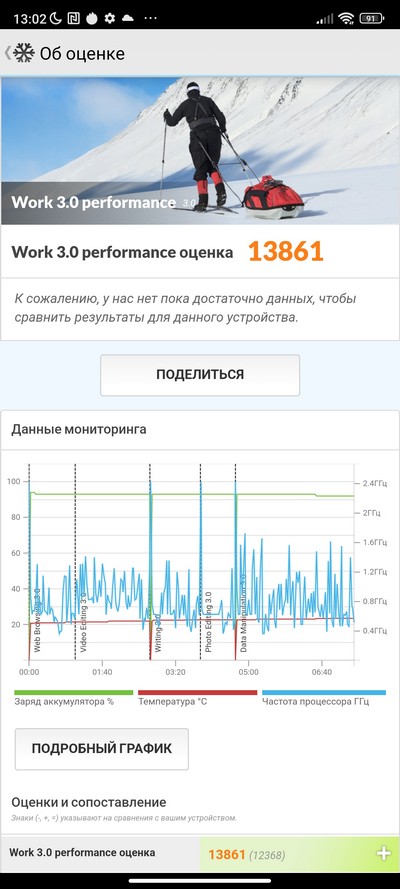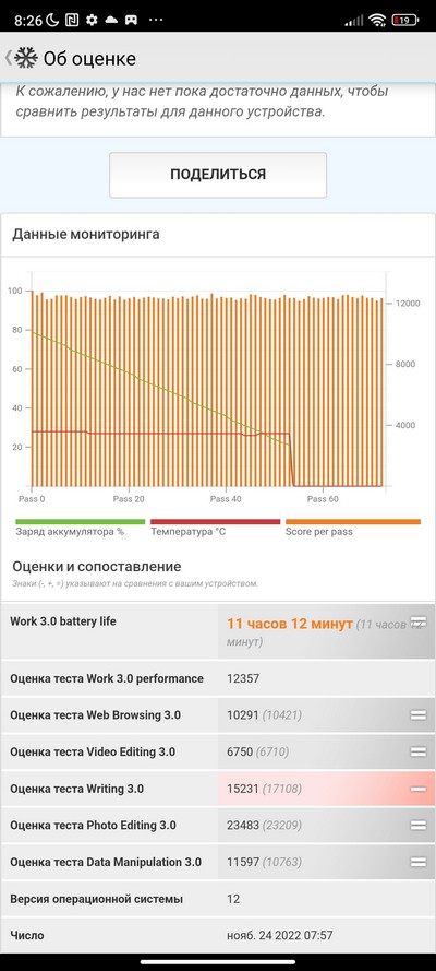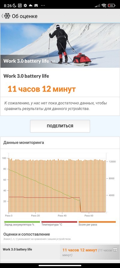 Синтетический тест PCMark. Ожидал, что будет 13-14 часов, но и так неплохо - в смешанном режиме при серьезной нагрузке смартфон продержится часов 20.