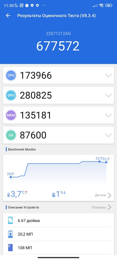 Камеры: основная 108 Мпикс, f/1,7, матрица 1/1,67", PDAF, OIS; 8 Мпикс f/2,4, 1/4" сверхширик, 2 Мпикс f/2,4 макро; видео 4К/30fps