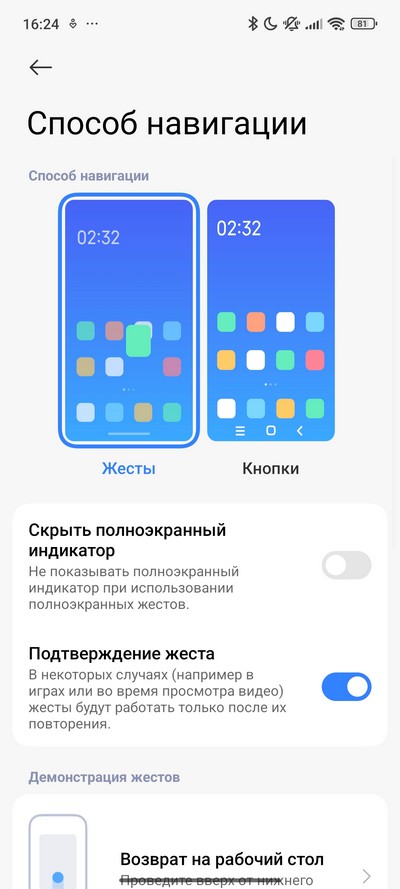 Как обычно для смартфонов Xiaomi, управление можно осуществлять с помощью экранных кнопок (настраиваемых) или с помощью жестов. Это настраивается в пункте меню "Безграничный экран". Также дополнительно можно настраивать функции кнопок и жесты.