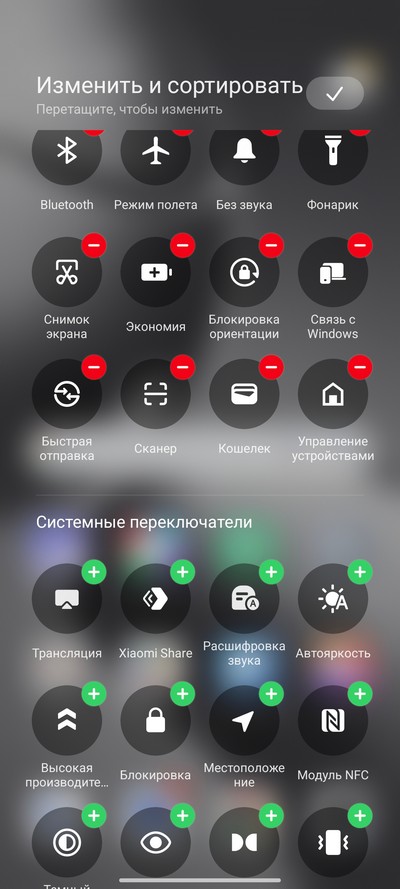Область быстрых переключателей и их настройка.