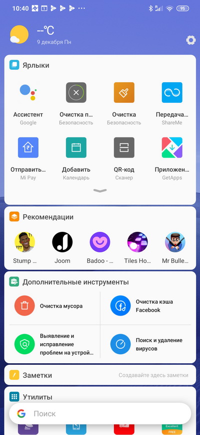 Интеллектуальный помощник (система виджетов) с настройками. Помощник появляется при пролистывании основного десктопа вправо (также его можно отключить).
