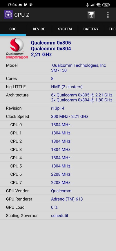 Платформа: Qualcomm SDM730 Snapdragon 730G (8 nm), CPU Octa-core (2 × 2.2 GHz Kryo 470 Gold & 6 × 1.8 GHz Kryo 470 Silver)
