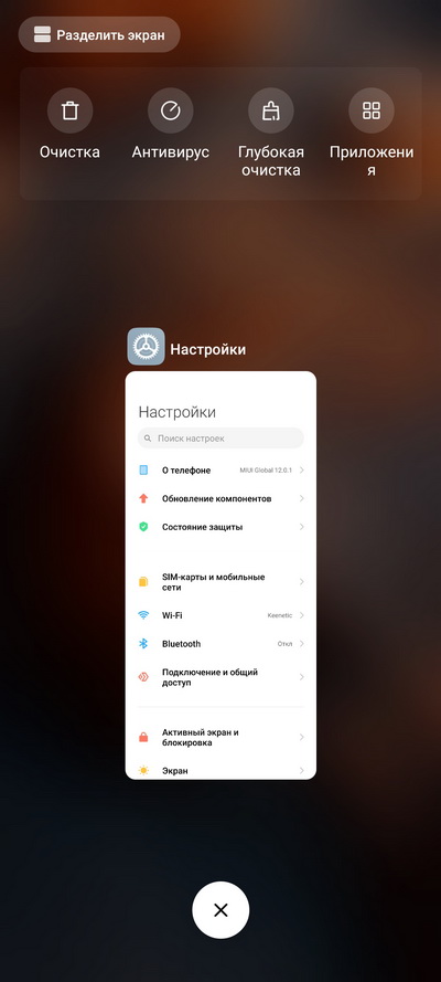 При вызове запущенных приложений появляется возможность разделить экран (в верхнюю часть нужно перетащить желаемое приложение, в нижней части можно выбрать еще одно приложение), также здесь есть вот такие пиктограммы очистки, антивируса и приложений.