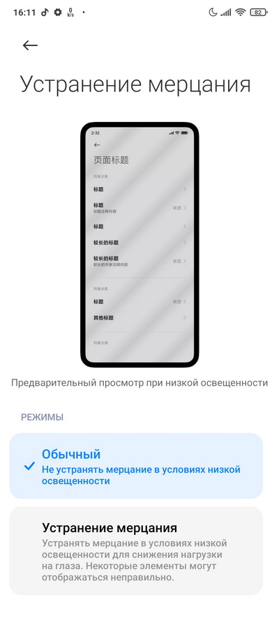 Можно включить устранение мерцания (тесты - ниже), переключиться на темный режим.