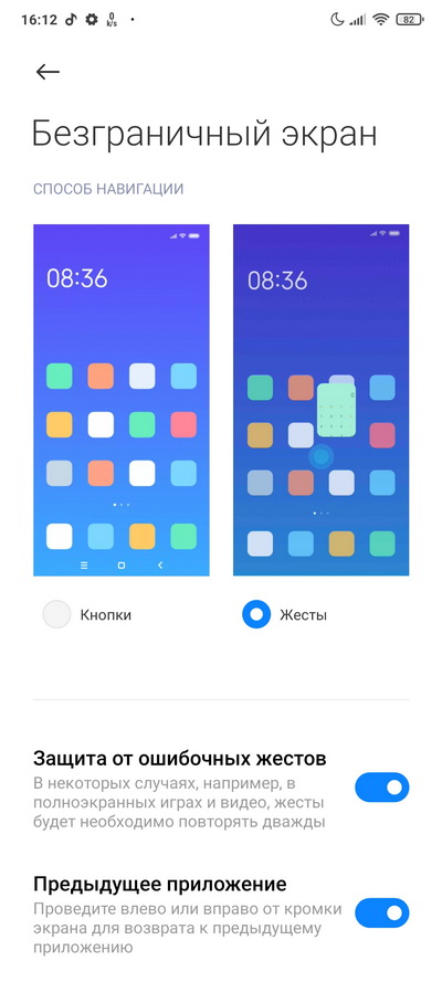 Традиционная для смартфонов Xiaomi возможность вместо экранных кнопок (настраиваемых) задать управление жестами. Это настраивается в пункте меню "Безграничный экран". Также дополнительно можно настраивать функции кнопок.