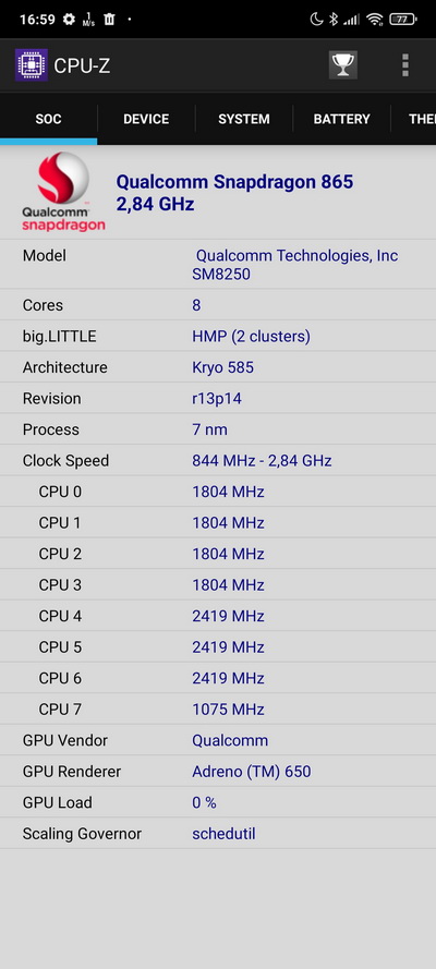 Процессор: Qualcomm SM8250 Snapdragon 865 (7 nm+), Octa-core (1x2.84 GHz Kryo 585 & 3x2.42 GHz Kryo 585 & 4x1,80 GHz Kryo 585)