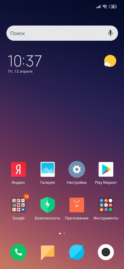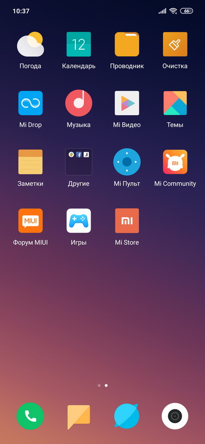 Android 9, оболочка MIUI 10.2. Главный десктоп и установленные в системе приложения.