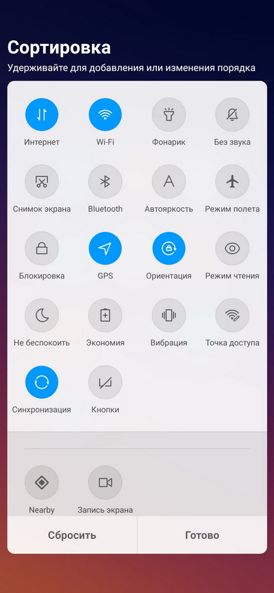 Настраиваемая область быстрых переключателей.