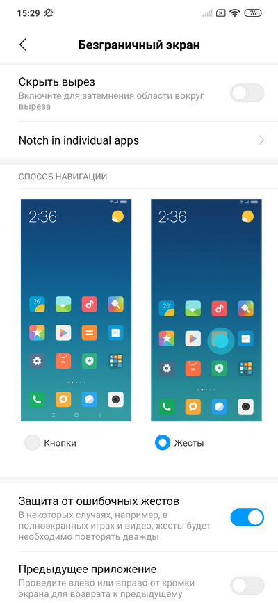 Для тех, кого раздражает "капля", ее можно скрыть, но здесь это работает иначе, чем у Huawei: если включается данная опция, то верх экрана сдвигается на одну строчку и верхняя часть с камерой становится черной без всякой информации. Также это можно задать по отдельности для каждого приложения.
