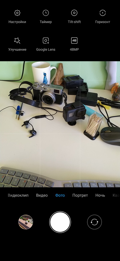 Традиционный интерфейс для камеры Xiaomi с одной-единственной странностью: вместо того чтобы режим 48 Мпикс сделать или в виде верхней пиктограммы, или в виде закладки снизу (так сделано у Xiaomi Mi 9, и это вполне удобно), они этот режим зачем-то унесли аж в меню дополнительных режимов и настроек, что неудобно.