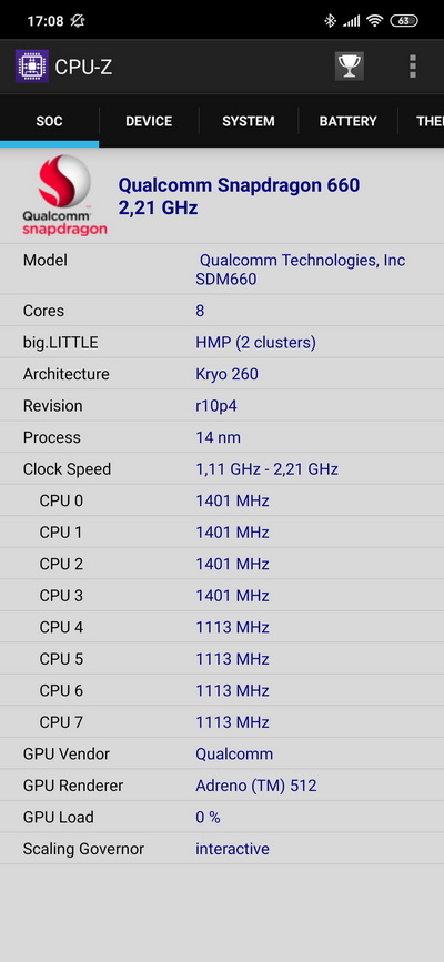 Процессор: Qualcomm Snapdragon 660, 8-ядерный