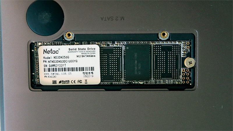 Под ней - тот самый SSD M.2 на 256 ГБ. Так что если вы захотите заменить SSD на более емкий, это спокойно можно сделать, не разбирая ноутбук.