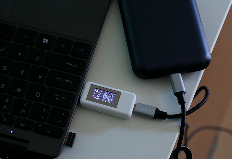 Power Delivery здесь также поддерживается, поэтому ноутбук спокойно заряжался от аккумуляторной батареи Xiaomi ZMI 10: зарядка шла на 28 ваттах, этот аккумулятор может зарядить данный ноутбук раза два: его емкость - 72 ватта).