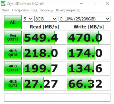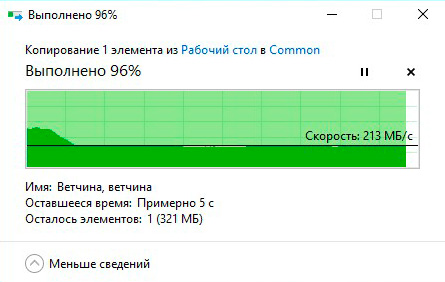 Погонял на этом ноутбуке 10-гигабайтный файл из папки в папку: 213 мегабайт в секунду - очень хорошо.