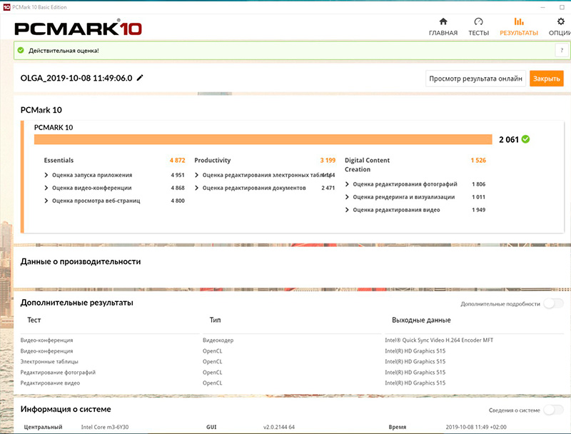 Режим под нагрузкой. По тестам PCMark, где имитируется довольно серьезная нагрузка (но это не стресс-тест, это аналог теста для смартфонов), получилось 3 часа 24 минуты.  Это, с одной стороны, немного, но, как показывает практика, для обычного домашнего применения этот результат нужно умножать минимум на 1,5.