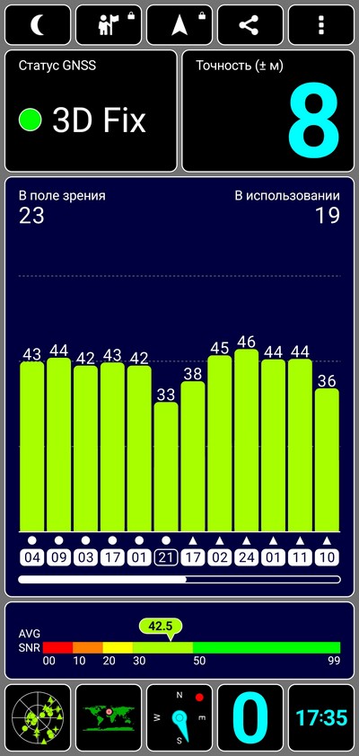 Холодный старт был не особенно быстрый: смартфон сразу увидел спутники, но не спешил их использовать. В результате координаты при первом запуске прочухивались секунд тридцать. Но с того момента, как смартфон стал использовать почти все спутники, в дальнейшем и после перезагрузки он мгновенно выходил на рабочий режим и с навигацией никаких проблем не было.